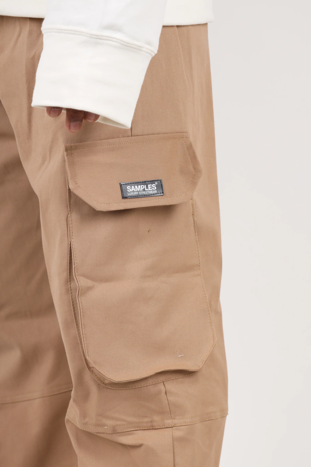 Cargo oversized de gabardina premium de 7oz, con bolsillos con fuelle, cierre en tobillos, bolsillo chino y tag de goma, color camel.