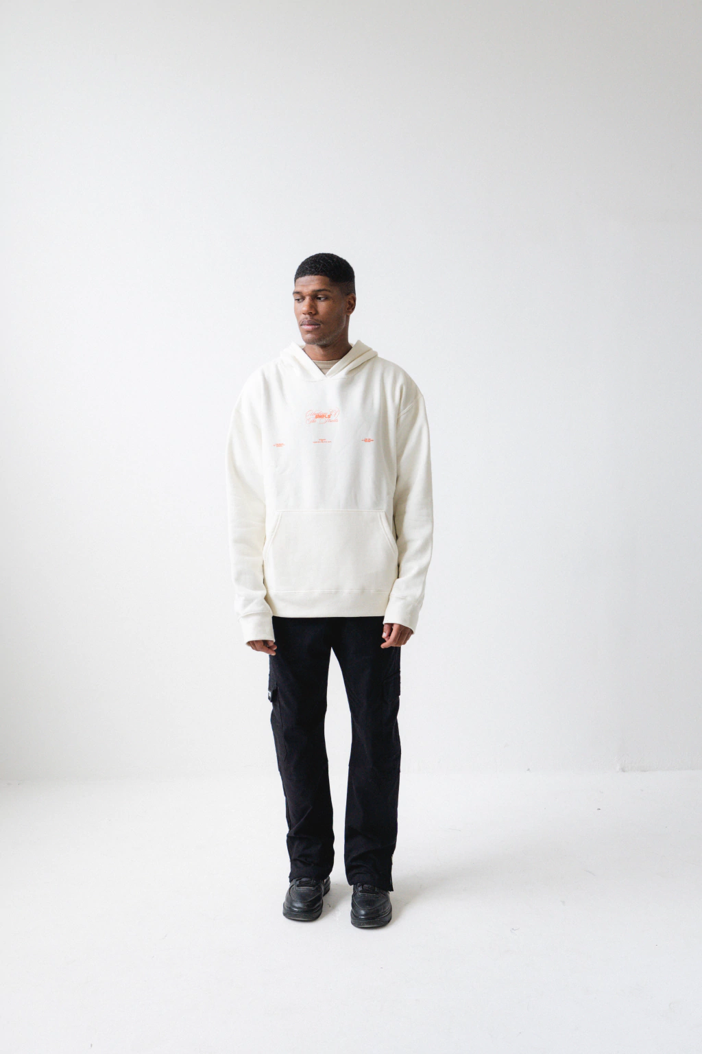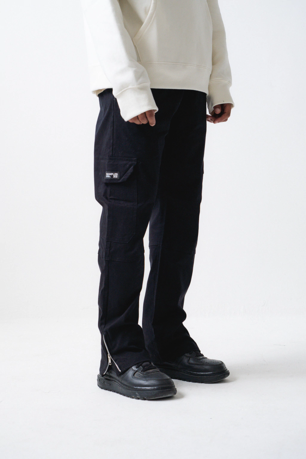 Cargo oversized de gabardina premium de 7oz, con bolsillos con fuelle, cierre en tobillos, bolsillo chino y tag de goma, color negro.