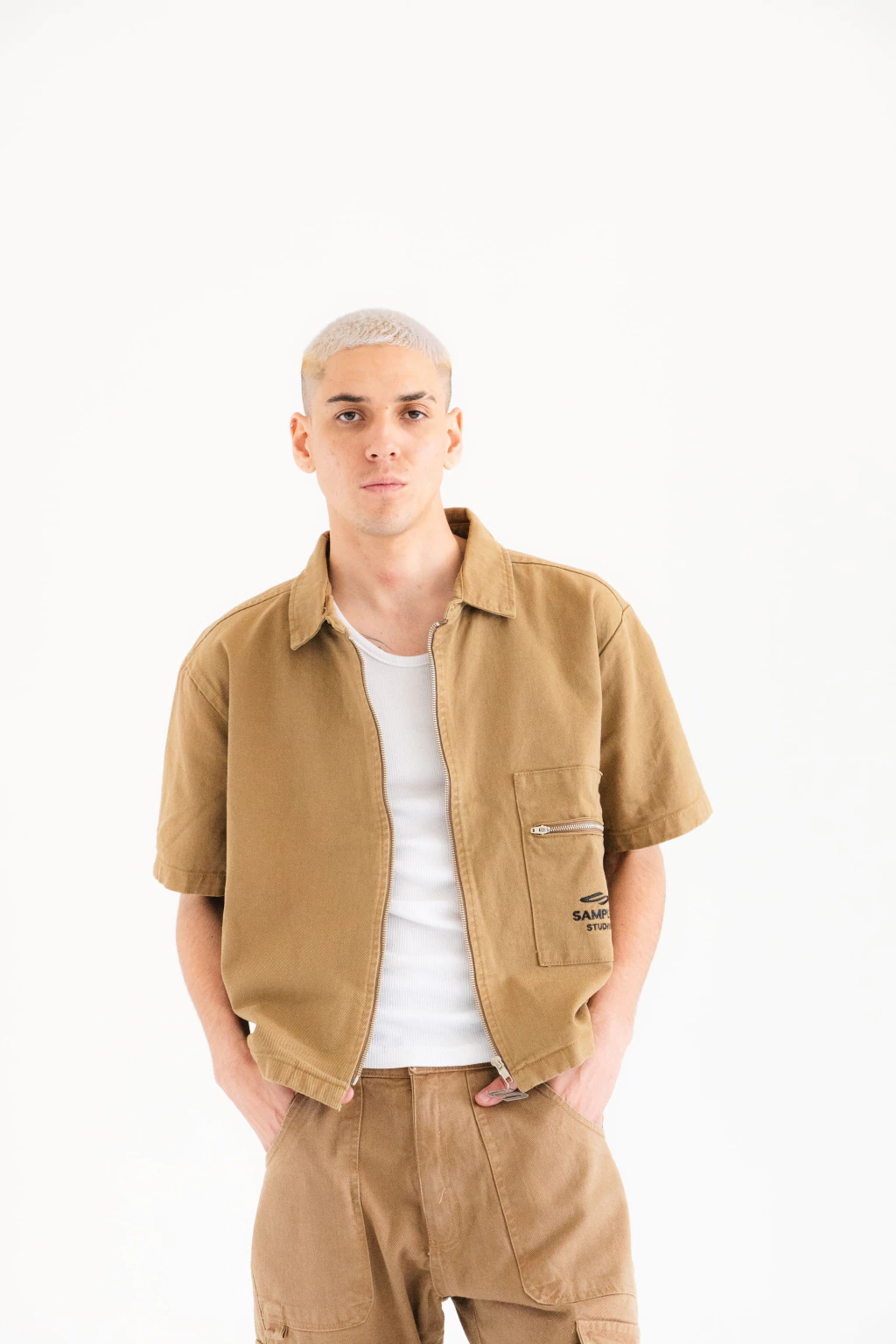 Sobrecamisa boxy fit, confeccionada en bull, manga corta.Cierre frontal en cremallera y bolsillo con cierre en lateral. Aplique de logo en el cierre.