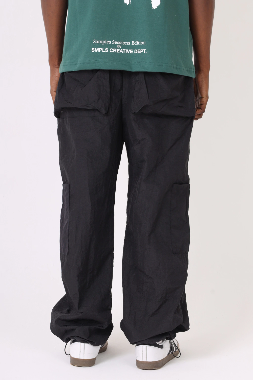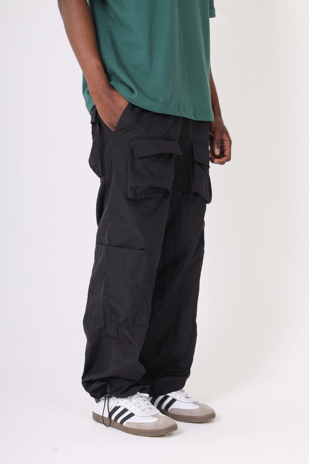Parachute de nylon brillante color negro, con bolsillos cargo frontales, traseros y laterales, regulable en cintura y puños, color negro.