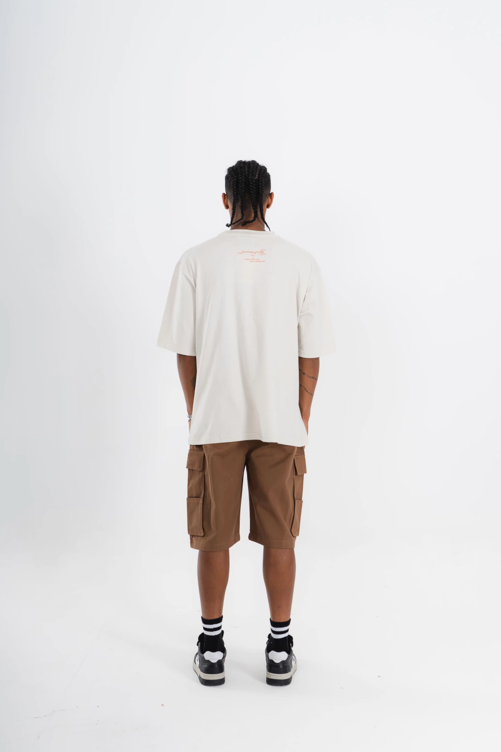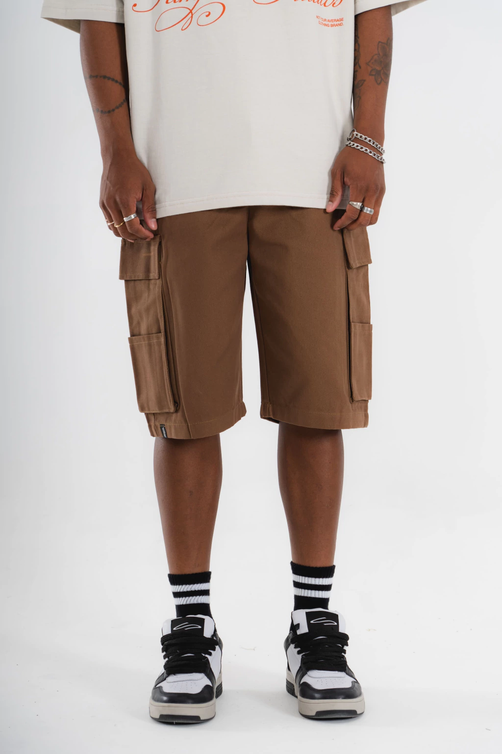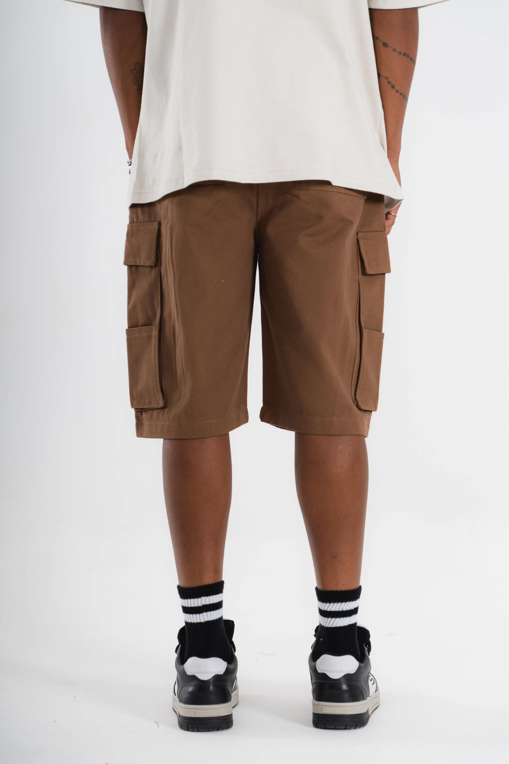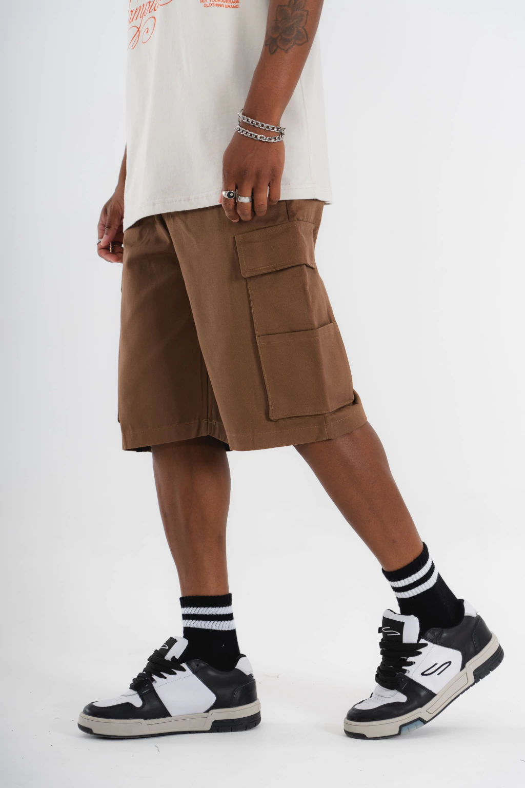 Berrmuda Cargo oversize fit. 4 bolsillos. gabardina chocolate. Pasacinto, cierre frontal con cremallera, y botón de metal.