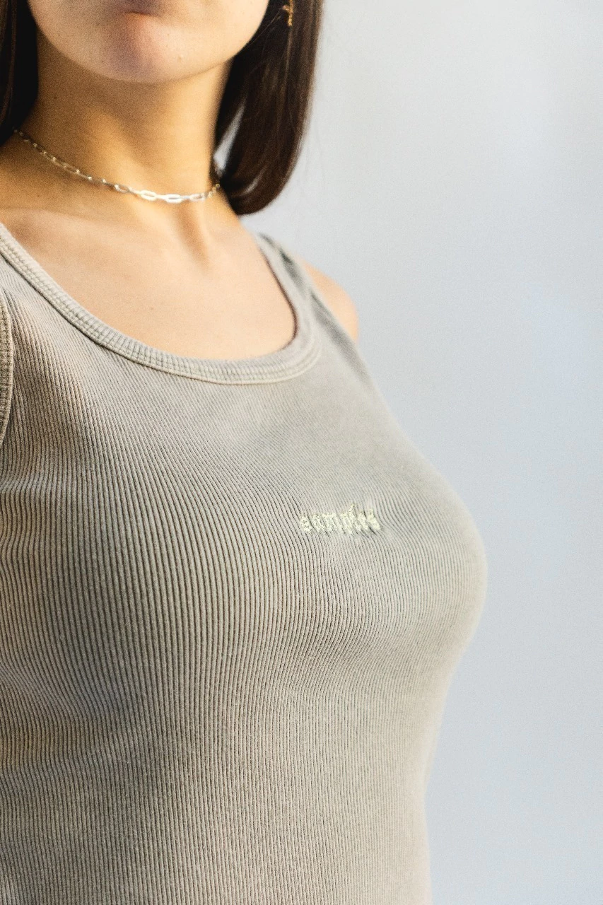 Musculosa de algodon morley pesado color gris piedra lavado, con bordado en el pecho